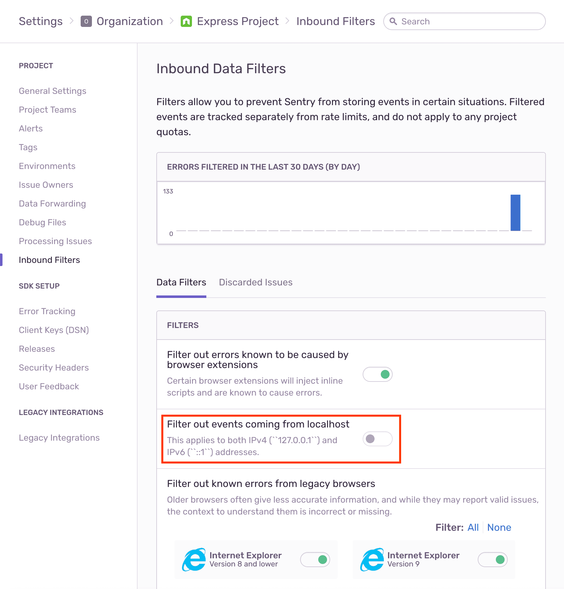When capturing errors locally, ensure that your project's data filter for filtering localhost events is toggled off: